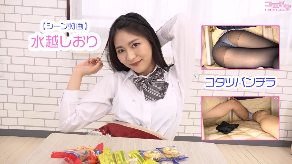 ほっそりと華奢な身体は透き通るような美白。すぐに恥ずかしそうなはにかみ笑顔をしちゃう北村めいちゃん。こたつではお菓子を食べたりゴロゴロしながらのパンチラ。靴下を脱いだらさらに際立つ美白。王道の教室パンチラはもちろん、マイクロビキニでのボール運動、OL衣装でのダメダメOLパンチラではご本人に「全然仕事してませんね~(笑)」と突っ込まれてしまいました、からの攻められちゃう展開。そしてセクシー制服と、いろいろなチャレンジをしてくれた北村めいちゃん、随所に見える恥ずかしそうなはにかみ顔で際立つ控えめで不慣れだからこそのエロスをご確認ください。
