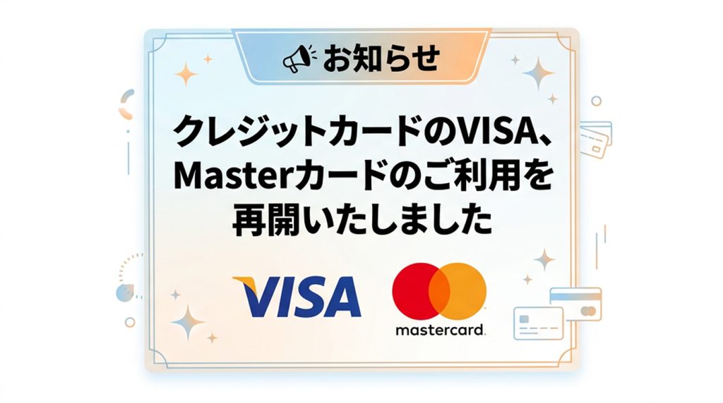 【重要】【お知らせ】VISA、Masterカードでの決済を再開いたしました